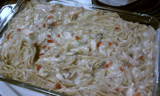 Mix together the Cream of Mushroom Soup, Onion, pimentos, Lawry's Seasoned Salt, Cayenne, and Salt and Pepper. Then add in the Chicken, 2 C Shredded Cheese, Broth, and Spaghetti. Mix everything together really well. Taste to check seasoning.